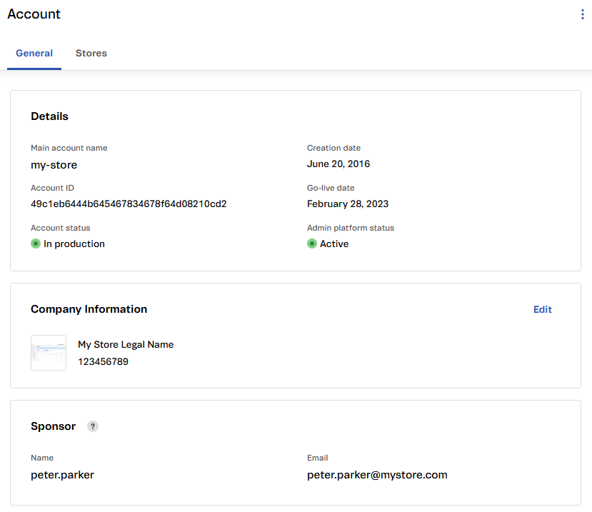 The Account page is divided into two tabs: General and Stores. Learn more about each tab below.