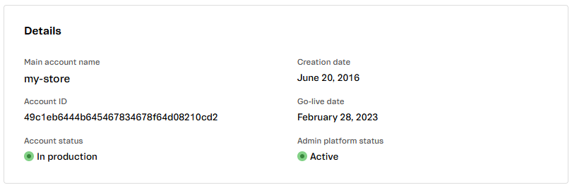 - Account status: Indicates whether your account is in production or not. An account in production is the first step to making your store available for customers in a public domain. This status can be either in production or not in production.