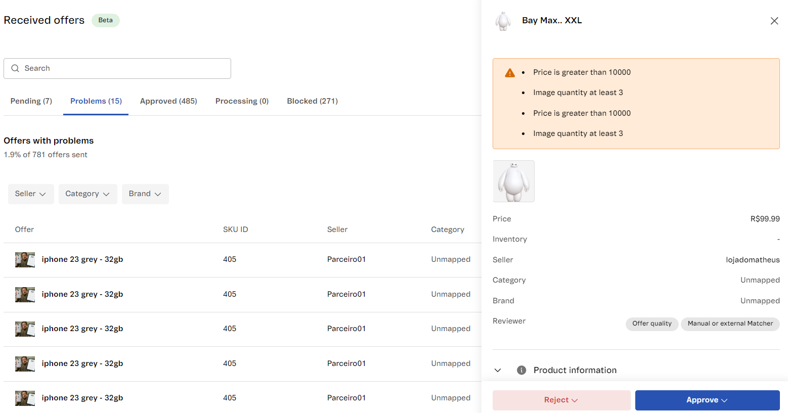 To identify the issue of an offer, simply click the name of the product. This will open a window with the product information, an error message, and the offer reviewer.