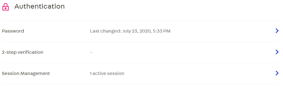 - In Authentication, you can find the password options, 2-factor authentication (2FA) for your VTEX Admin login and session management. See the options in detail below.
