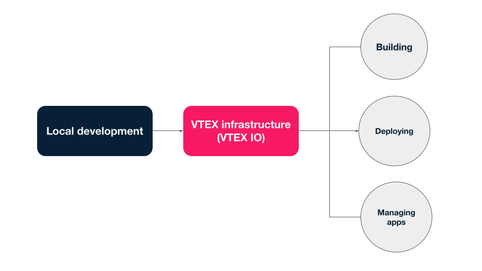 This means that with VTEX IO, you develop your code locally. However, when it comes to deploying and running the store, VTEX IO manages the infrastructure, CI/CD, and security and takes care of the deployment process. The image below shows how these concepts relate to each other: