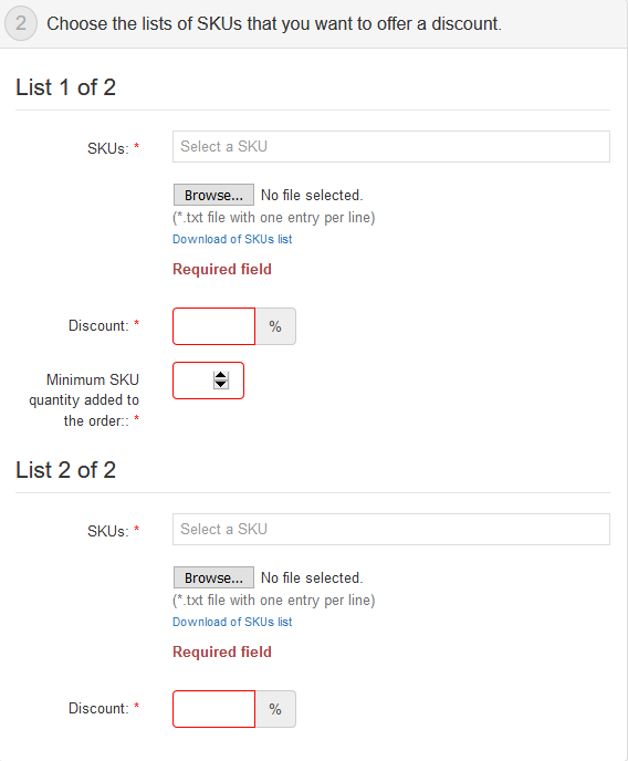 The promotion configuration screen offers two SKU lists, which can be added manually or using a spreadsheet.