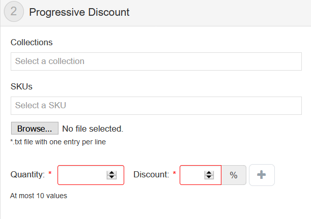 When configuring the Progressive Discount promotion, the store must define which collections or SKUs the promotion applies to. Then, it must choose the minimum quantity and the initial discount applied. For example: for the first 3 items, the customer will receive a 5% discount.