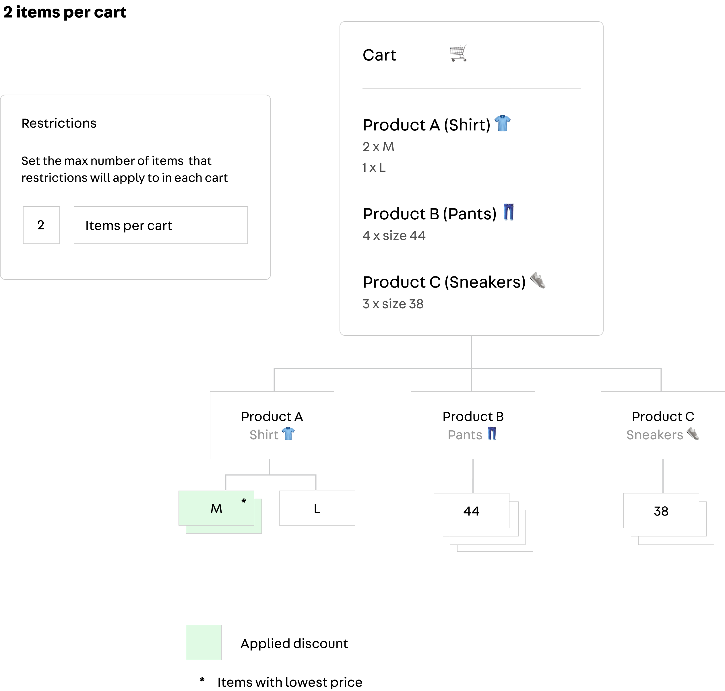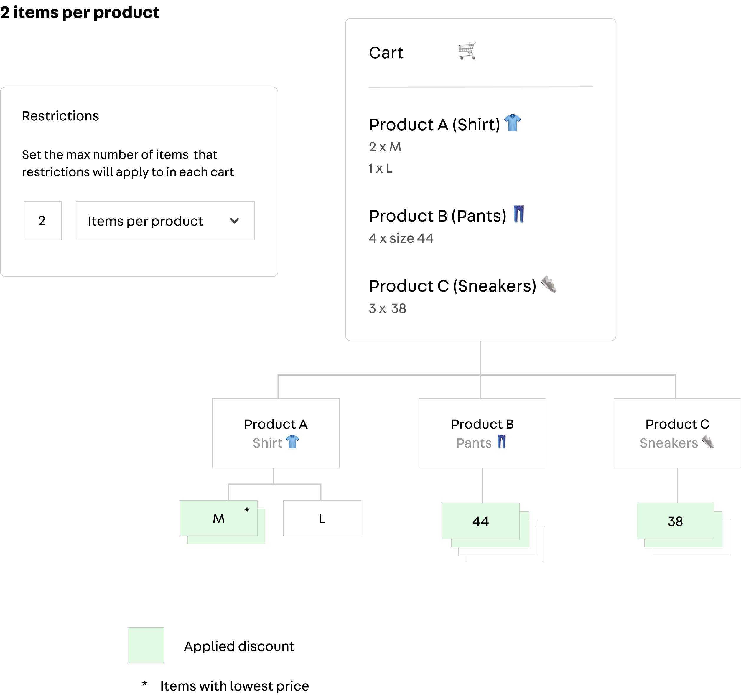 - Items by product: this setting restricts the promotion to a number of units per product. As in the example below, only two units per product will be eligible for the promotion. The lowest price determines which product items are eligible first.