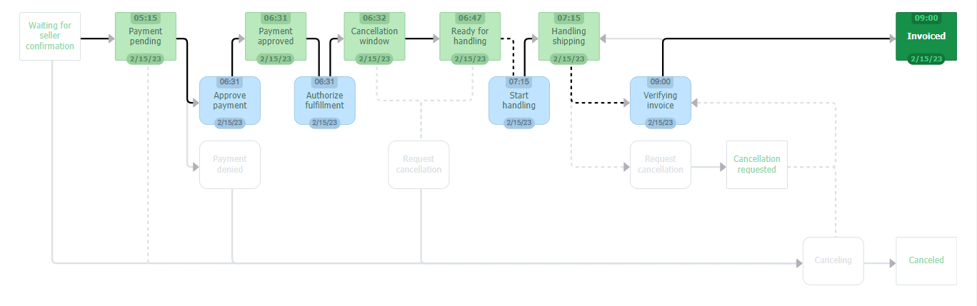 On the order details page, you can also track the progress of the order flow. The image below illustrates an example of this flow when the store acts as both a marketplace and a seller: