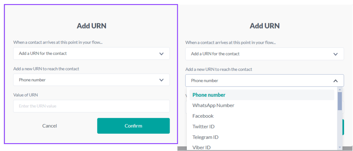 It is possible to add new URNs for your contact. You can select the type of URN to be added (Phone Number, Whatsapp, SMS, Telegram, etc.) and enter the new value, using some fixed value or a flow variable. To understand a little more about URN, you can visit the article on the subject