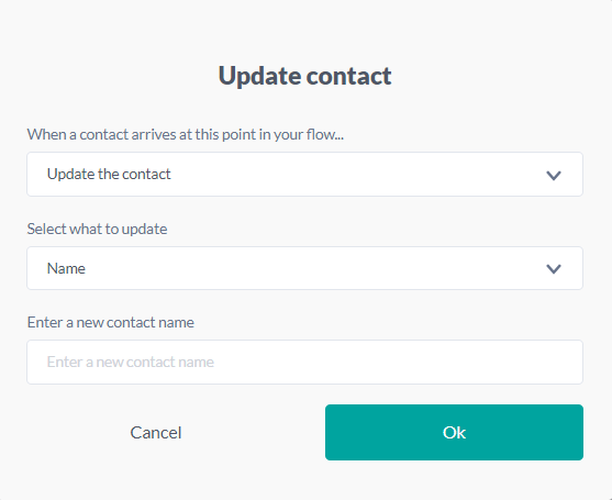 To fill in the contact fields, just use Update Contact. In it, you select the contact field you want to update, and after that you can enter a fixed value or a flow result. If the contact field does not yet exist, just write the name you want for it. To learn more about the contact fields, visit the contact article