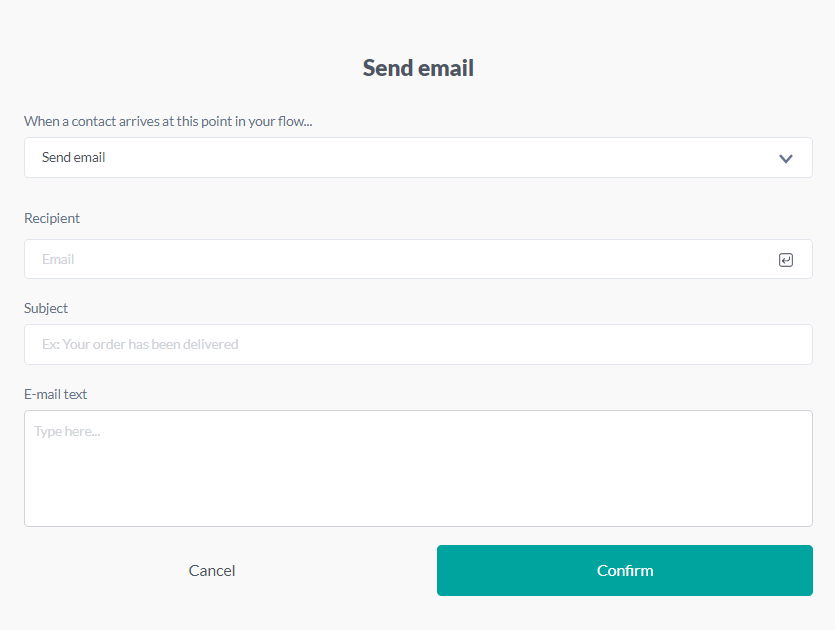 Here you can send an email to someone. This email can be sent either to the contact running the flow or to anyone else. Keep in mind that email is not a conversation channel on the Weni Platform, meaning that if someone replies to the sent email, it will go to the inbox of the email configured in the organization. To learn more, visit the project settings article.