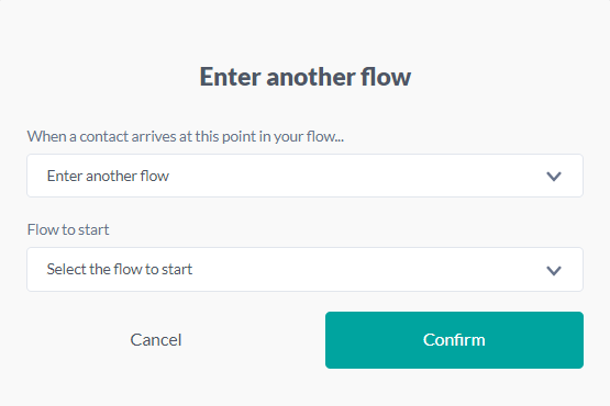 Here, we can start a new flow for the user. When the user enters a new flow, the flow he was in before (which can now be called the parent flow), is on hold until completion. In the meantime, the user will execute the new flow (which can now be called a child flow) and at the end of the execution, it will return to the point where it left off in the parent flow. To work, just choose the name of the flow you want among existing options.
