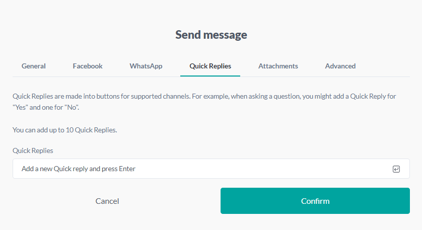 - Quick Replies : Allows you to create up to 3 predefined responses that recipients can quickly select.