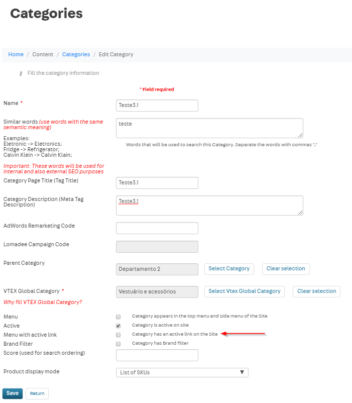 - If it is not checked, the category does not appear and the Lista Completa option will appear on the site.