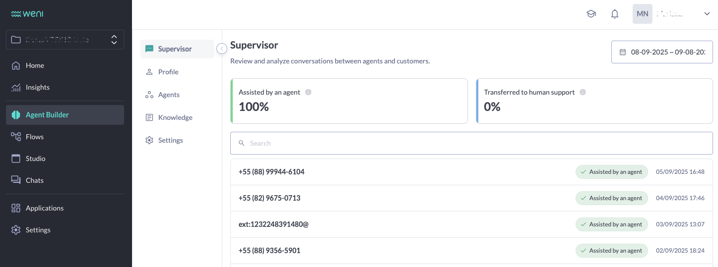 On this page, you can review and analyze conversations between agents and customers. It's divided into two sections: