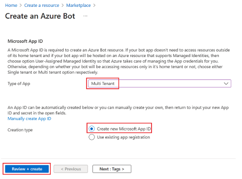 - Select the application type, multi-tenant is recommended. After that, select Review + Create.