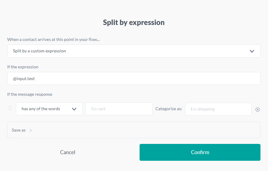 - starts with: If the answer / value starts with that sentence, it will follow the indicated route.