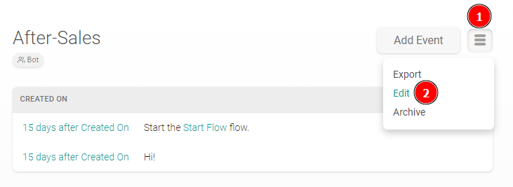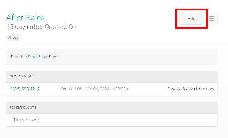 To edit when a message or flow will be sent, choose a different flow, or change the action from ""Send a message"" to ""Start a flow"" (and vice versa):