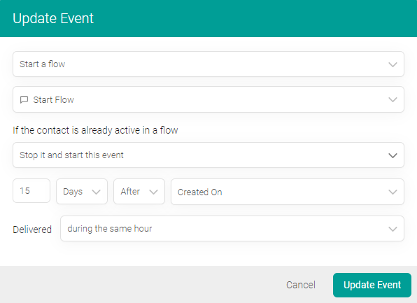 In the event update dialog box, you can make the following changes:Select the option to send a message or start a flow