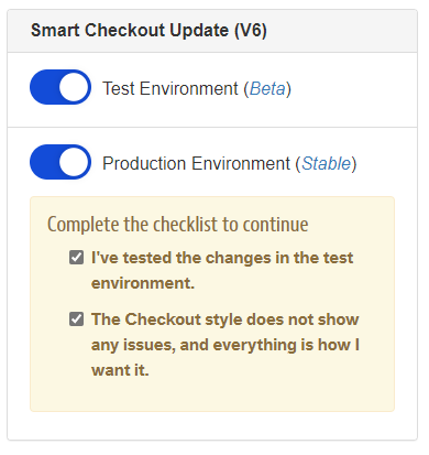 - Under Smart Checkout Update (V6), enable the Production Environment (Beta) option by clicking the button and in the two checkboxes of the checklist.