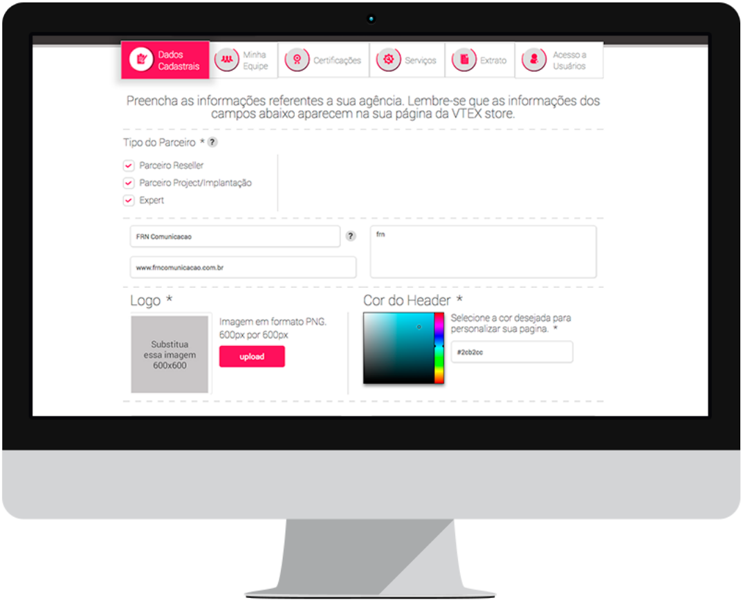In the first step there are some fields that deserve your attention, such as the header color. Where will it be applied? On your company’s page on the VTEX Store, as it is demonstrated in the image.