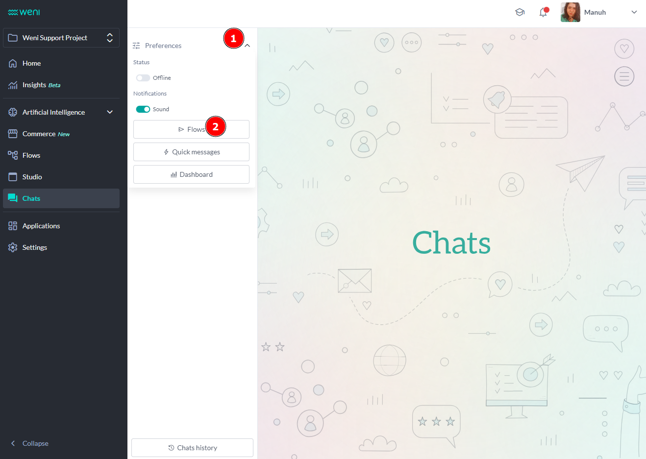 On the Chats screen, click the button below Preferences > Flows, as shown in the example: