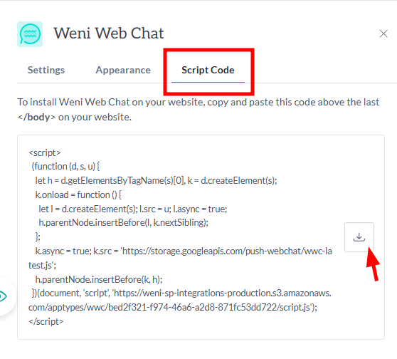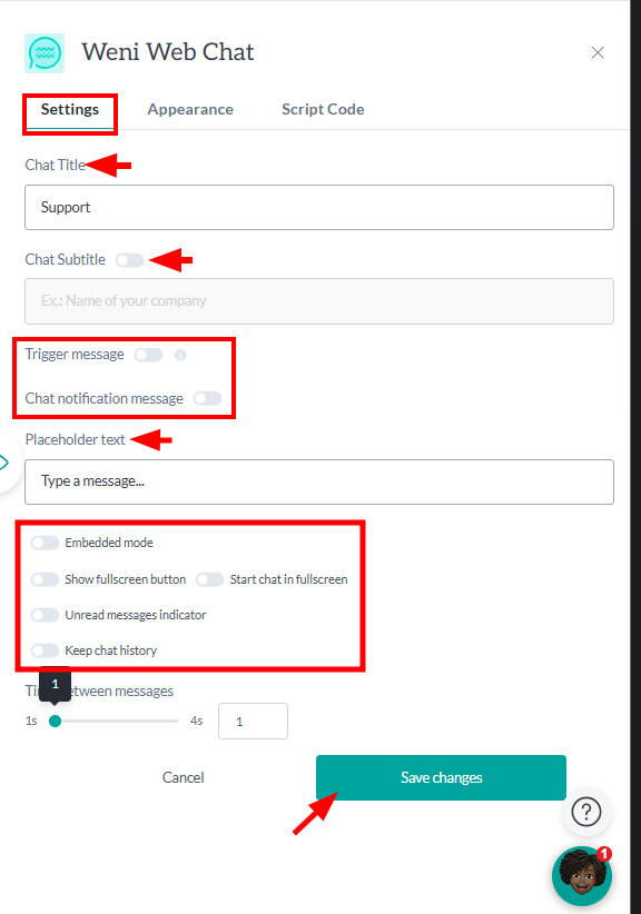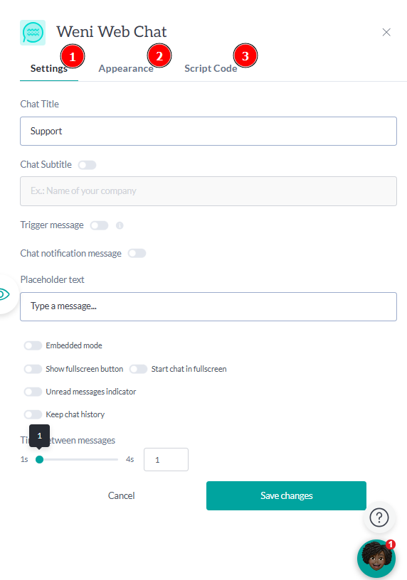 After finalizing your Web Chat customization, click on the Save changes button to save the modifications and generate the script code.- Script Code: Once the information is saved, a script code will be generated, which you should add to your website.