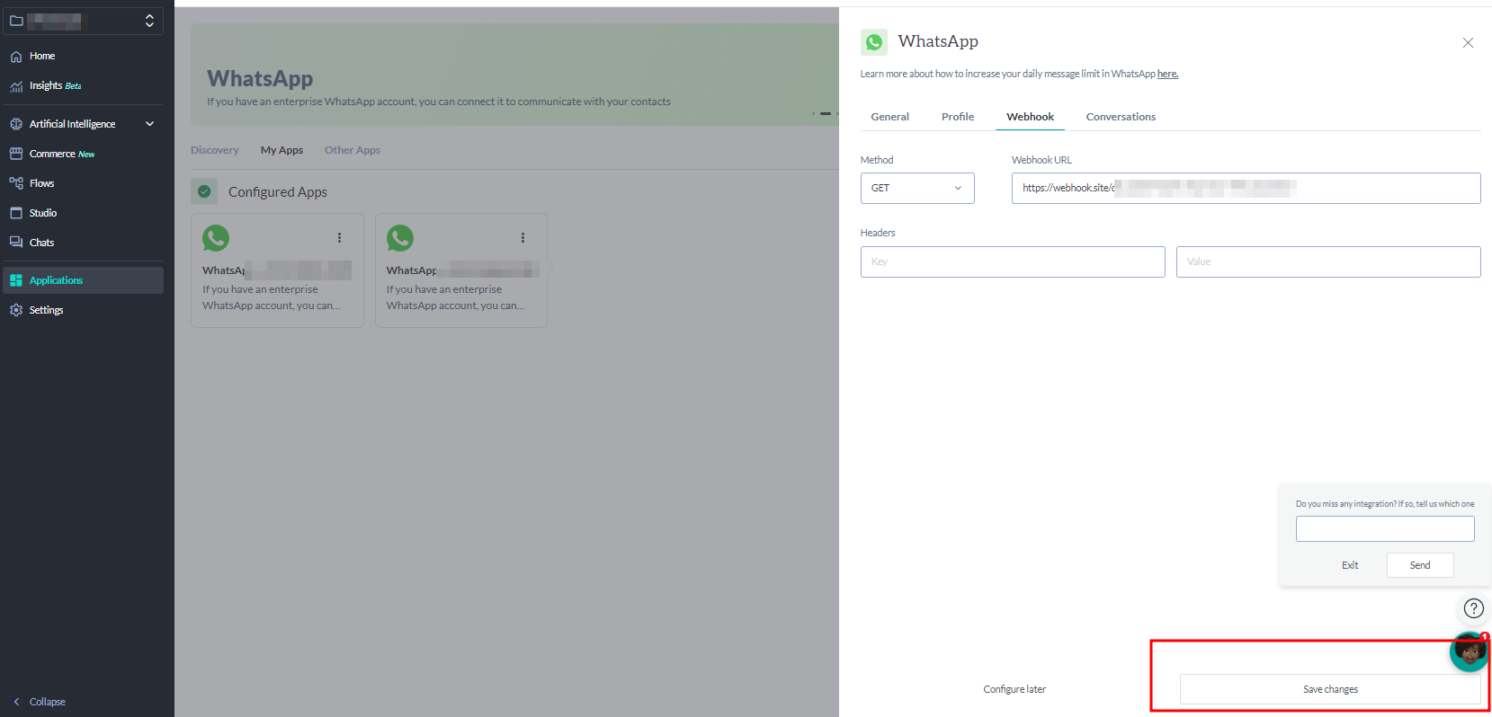 To configure your webhook, go to Applications > My Apps > WhatsApp Channel you want to configure > Webhook > Configure Method, URL, and Request Header: