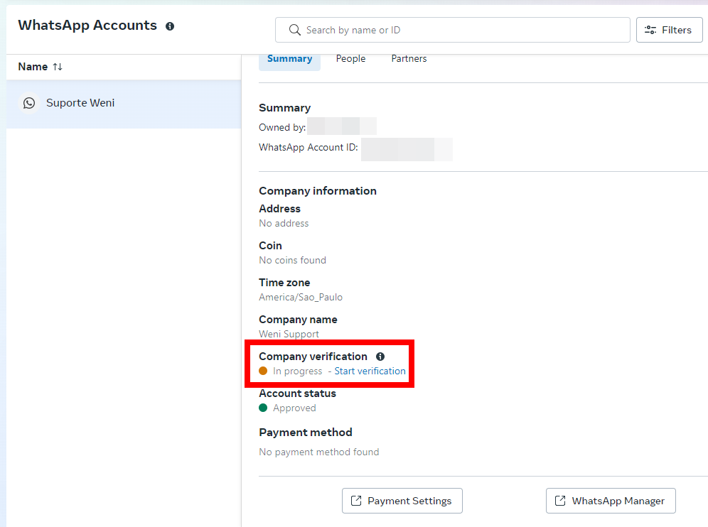If you have already integrated your number into our platform via the Integrations Menu > My Apps or if the link between your Meta Business and Weni has been accepted, the Start Verification button will be available for you in the new page opened through View Details.