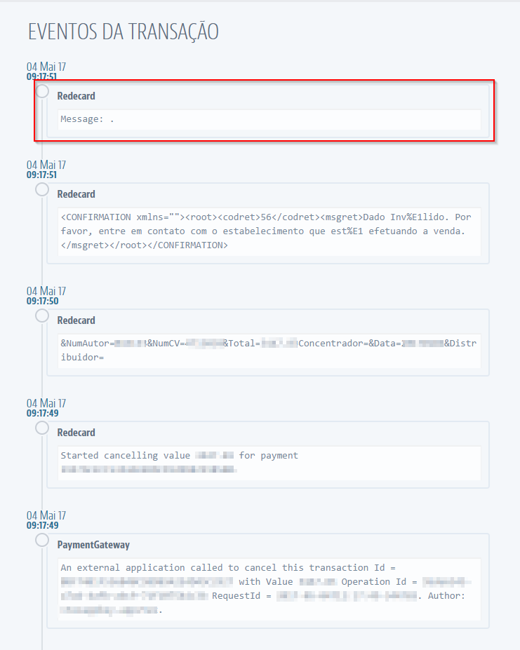 This happens when a transaction continues in Cancelling status indefinitely, preventing it from being cancelled and, consequently, preventing a request in OMS. This happens when VTEX is awaiting a response from the gateway system, but the correct response is not sent. We can see in the picture below an example of a gateway response preventing VTEX from proceeding with the cancellation process: