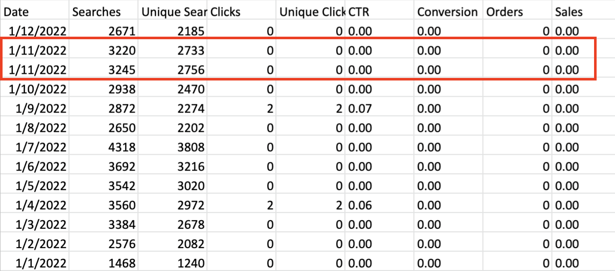 When a search report is downloaded, the table containing metrics like searches, clicks and unique clicks at the end of the report contains a date column showing duplicated entries without an apparent reason as you can see in the image: