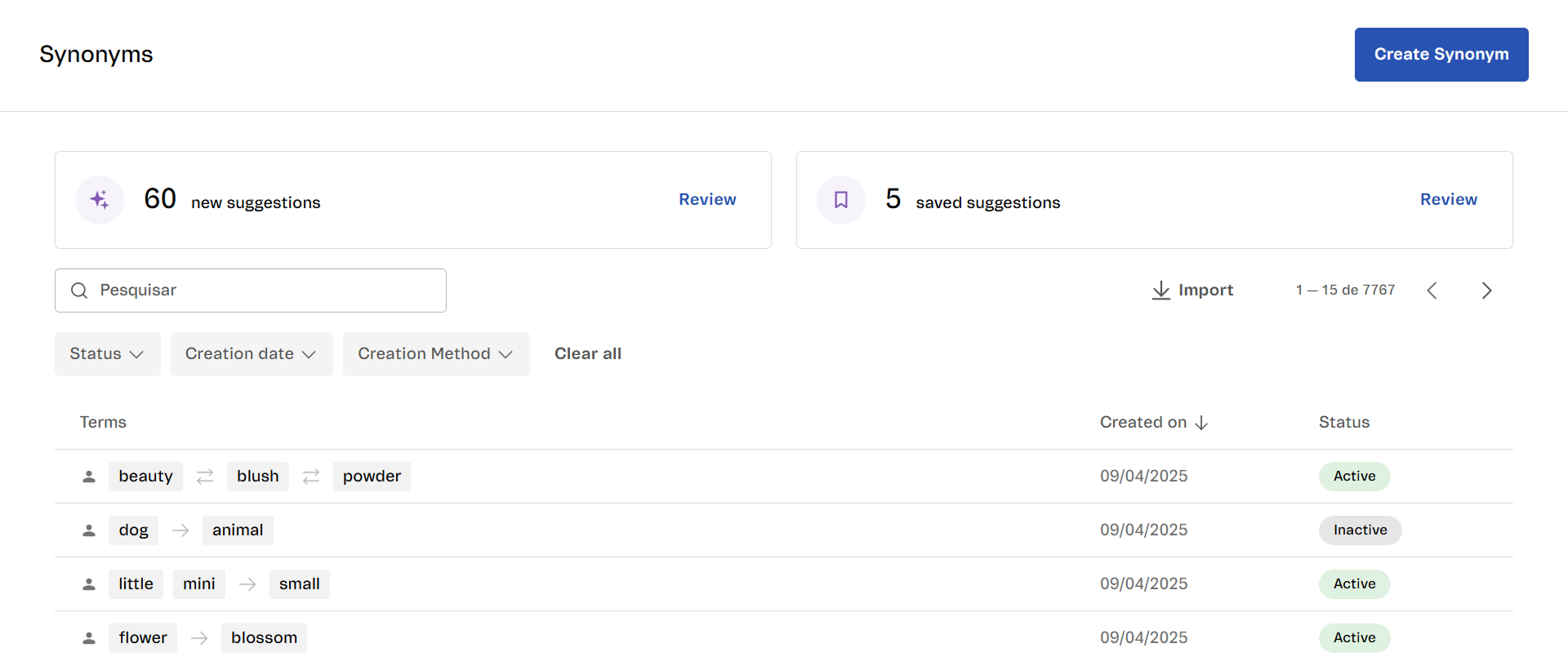 There are two ways to set up synonyms in VTEX Admin: individually or by importing a spreadsheet in CSV format. If you need to register synonyms in bulk, we recommend using the spreadsheet. See the instructions for each configuration form in the following sections.