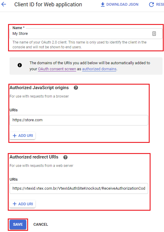 Authorized Domains: domains that may interact with this API should be included. These should be, at least, the domain of your store and the VTEX domain: