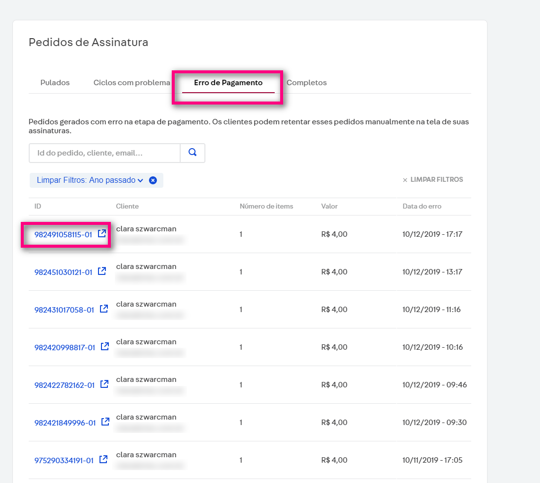3. Na seção Pedidos de Assinatura, clique na aba Erro de Pagamento.