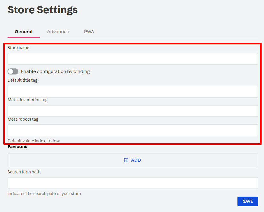 - Enable configuration by binding: This option is only valid for stores with multiple bindings. By enabling it, you can configure specific settings for tags and meta tags for each store's bindings. For stores with a single binding, leave this option unchecked.