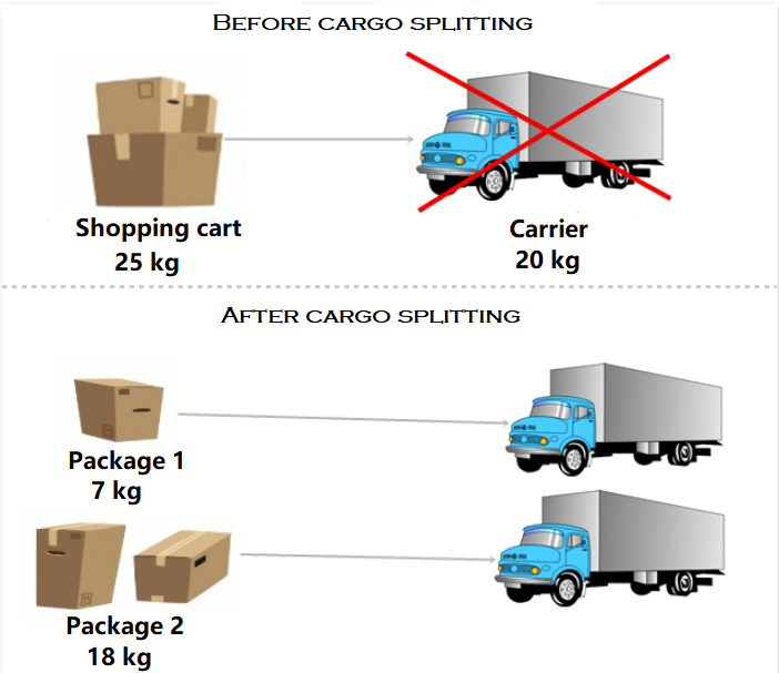 Cargo splitting is the configuration that allows a purchase to be divided into multiple deliveries, when the calculation of total weight exceeds the limit defined in the shipping policy.