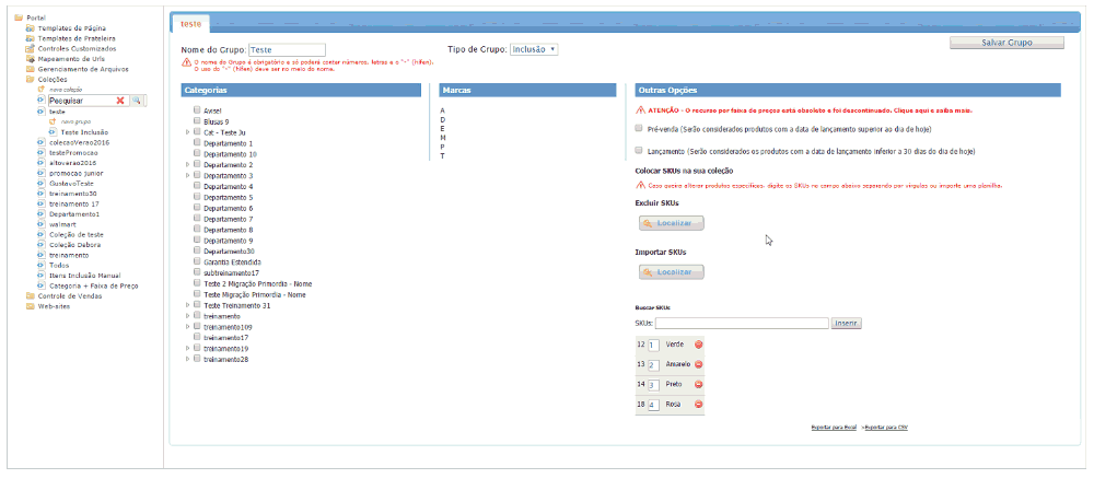 Unlike the previous version, where specific products were included using the Product ID, in the new module the manual inclusions are done using the SKU of a product. In the corresponding field, it is possible to type in the ID of one or several SKUs, separating the values with commas. E.g.: 2000004,2000009,2000005. In spite of the difference in the manner of registration, in practice the effect will be the same, since by associating an SKU with a group, the "father" product of that SKU will also be added to the collection. Where a product has more than one SKU, just add one of the SKUs to the group, and all associated SKUs will be included in it. The field for including the IDs does not permit the typing of alphanumerical characters or the use of combinations of the keys Control + C and Control + V. Also, when the number of SKUs on the list exceeds 10 items, a pagination control will become available. To exclude an SKU from the list, just click on the red button beside the corresponding SKU.