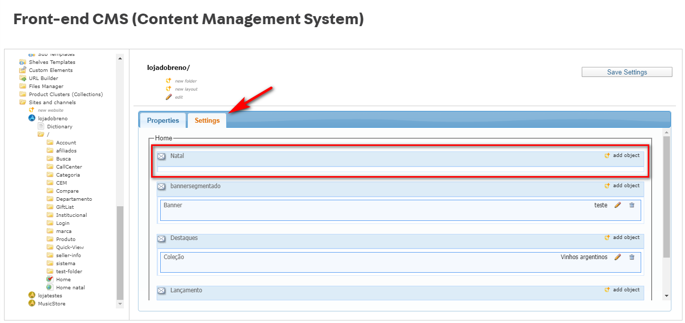 - Open the layout and then click on the Settings tab. The new placeholder should appear there, with the name equal to the id value defined in the control. For now, this placeholder is empty, meaning there are no objects inside it.