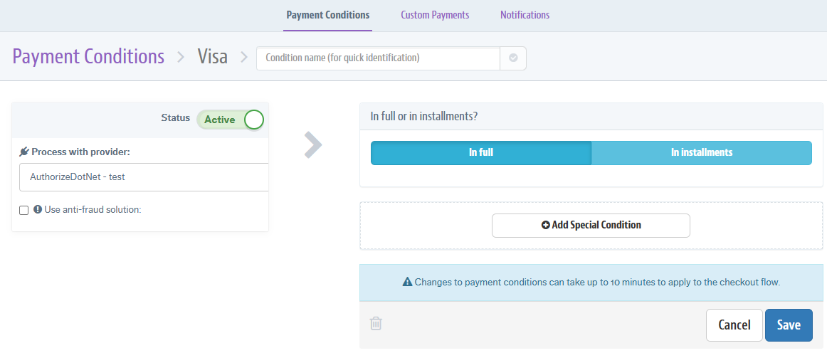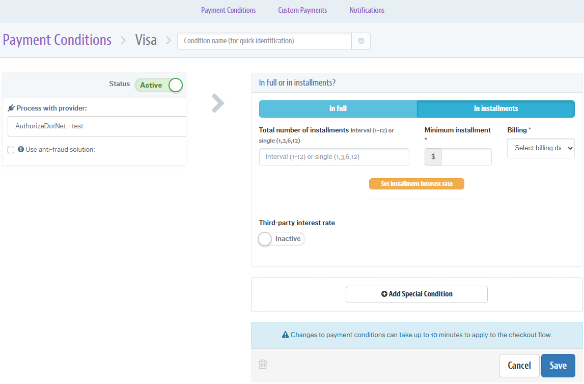 Any changes in payment conditions may take up to 10 minutes to appear at your store's checkout.