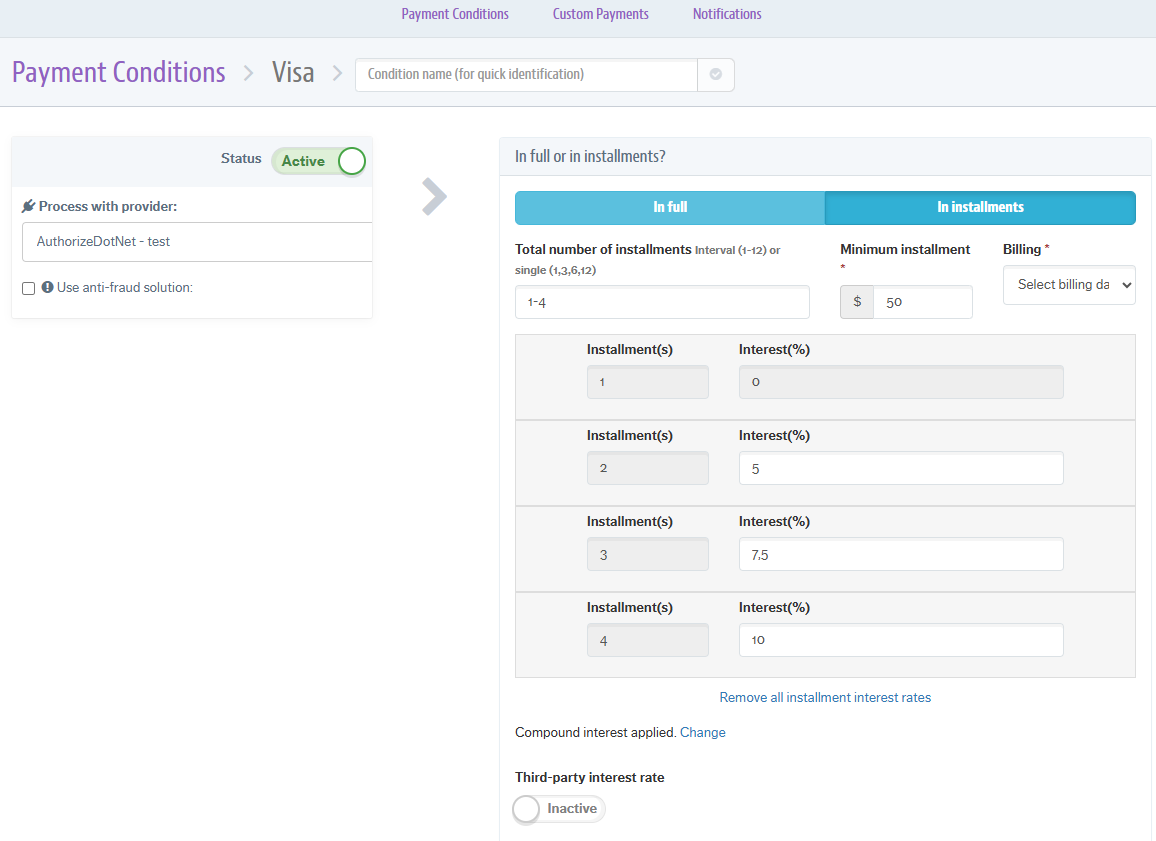 Payment conditions are the methods of payment displayed on the website for checkout. Through this functionality it is possible to configure options such as: installments, interest, payment special conditions.