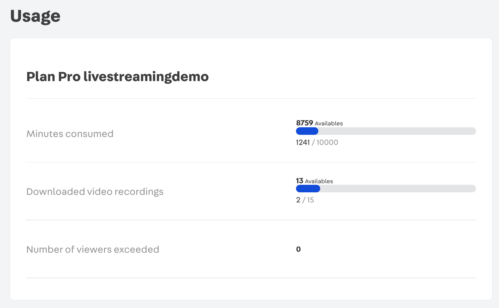 - Usage: This section allows you to effectively track the usage details of your plan. You can monitor the number of available live event minutes, downloaded video recordings, and events that have exceeded the maximum number of viewers.