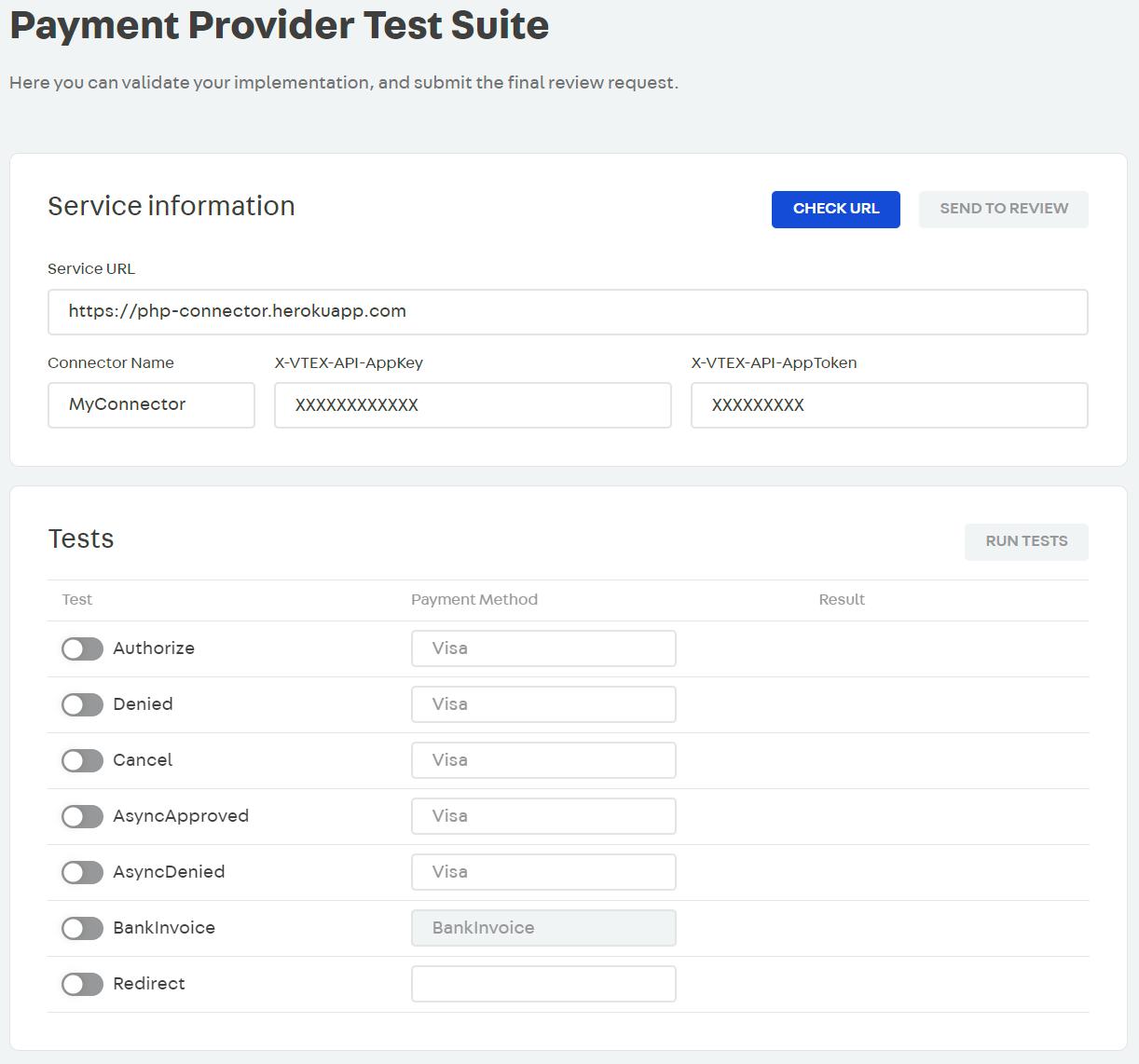 https://example.com/, the full URL for the /payments endpoint will behttps://example.com/payments. - AppKey and AppToken: The Test with AppKey and AppToken button allows you to choose whether or not to configure the values of these fields, which can make testing easier during the development stage. If you do not enable this option, the credentials will be sent in the headers as an empty string.