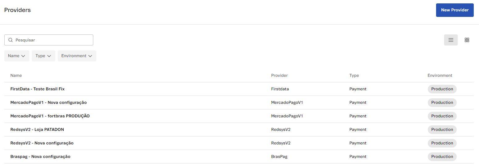 The main provider management screen, available in the VTEX Admin under Store Settings > Payments > Providers, displays all the payment or antifraud providers in a store. To allow quick access to information on specific providers, you can search or use filters.