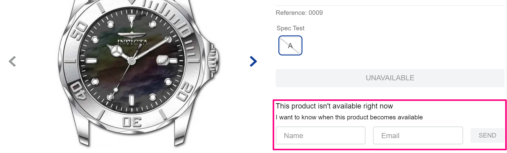 See below an example of how the Notify me option is displayed in a store. To receive a notification when the item is back in store, the customer must type in the name and the email in the marked fields and then click on the Send button.