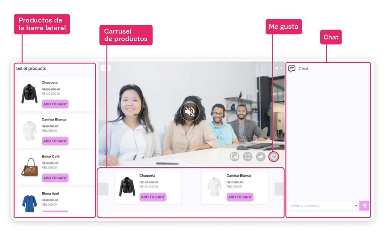 • Carrusel de productos: muestra un carrusel con una colección de productos en una vista horizontal debajo del reproductor de video durante el evento en vivo.