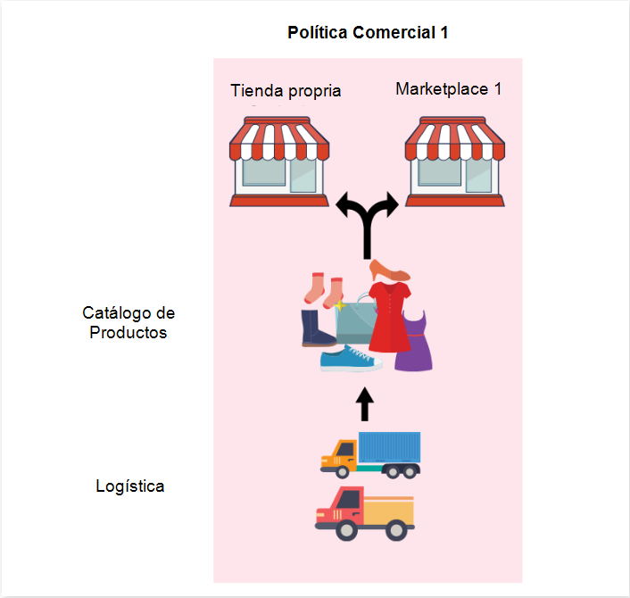 La misma política comercial puede ser utilizada por más de un marketplace o entre tienda principal y marketplace. Para esto, basta con utilizar el mismo ID de política comercial en la configuración. Al hacer esto, se utilizará el mismo catálogo y la misma logística para las tiendas o canales que están configurados con la misma política comercial.