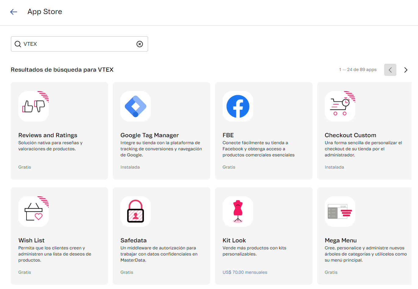 - Explora: lista de las principales aplicaciones utilizadas en las tiendas VTEX. Aquí las aplicaciones aparecen en formato de tarjetas cuadradas, donde puedes ver el nombre, el subtítulo y el costo de la misma. Al hacer clic en una tarjeta, accederás a la página de la aplicación.