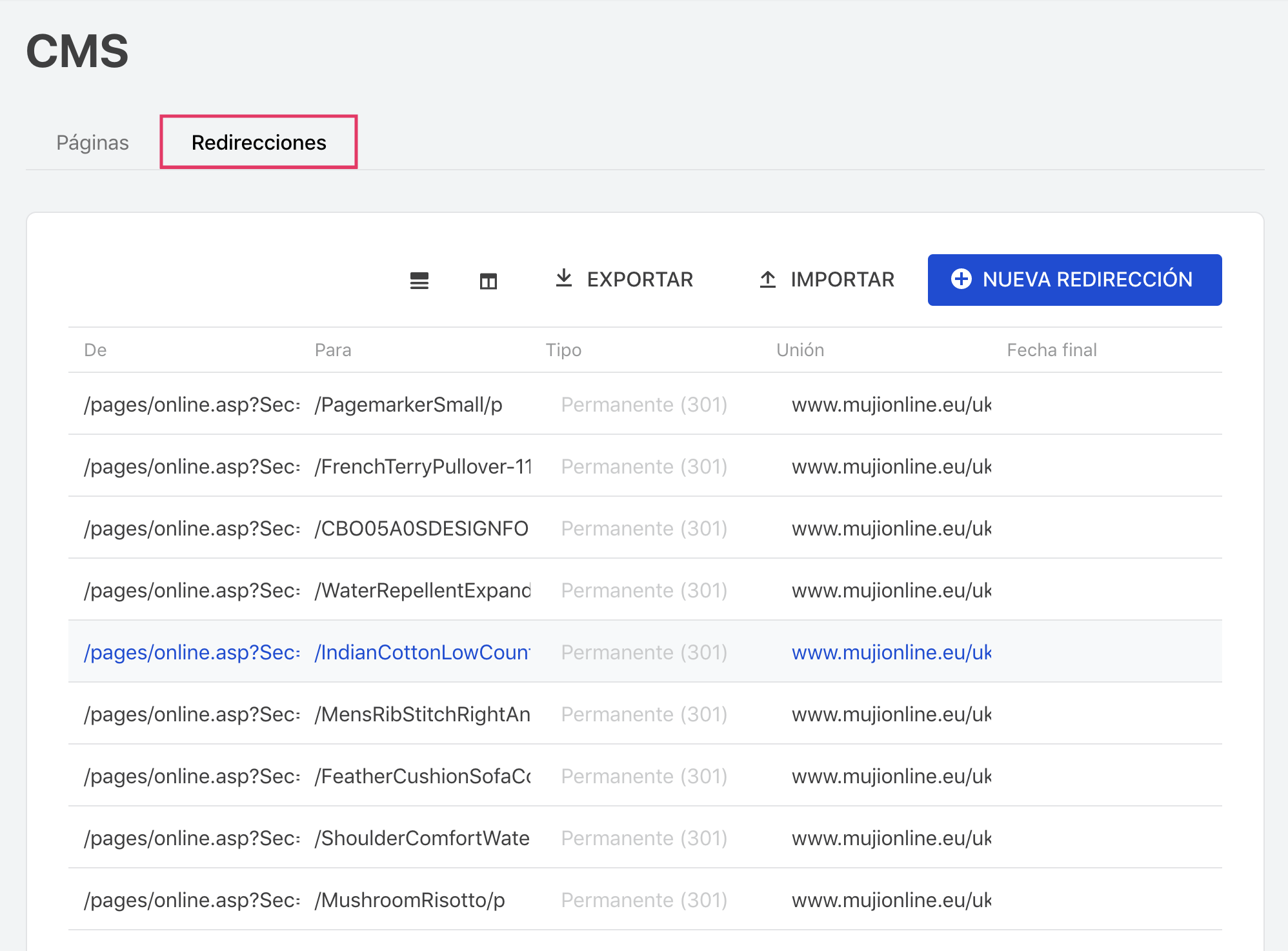 Para gestionar las redirecciones de su tienda en masa, puede importar y exportar la plantilla de redirecciones.