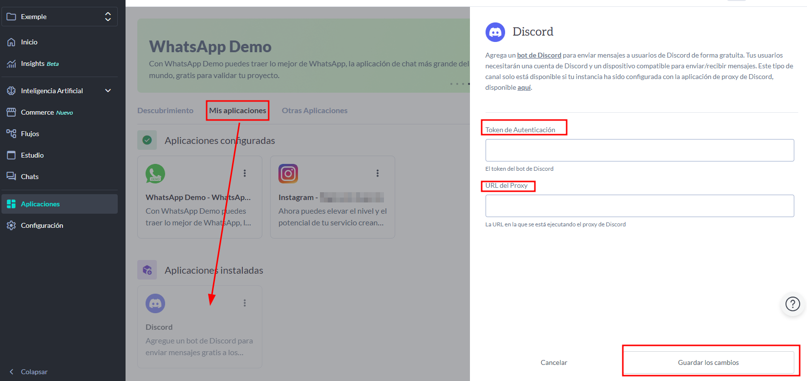 - Después de agregarlo a ""Mis Aplicaciones"", inserta tu discord_bot_token proporcionado por la página de Desarrolladores de Discord y la URL del Proxy, que es la URL donde el proxy de Discord está ejecutándose.