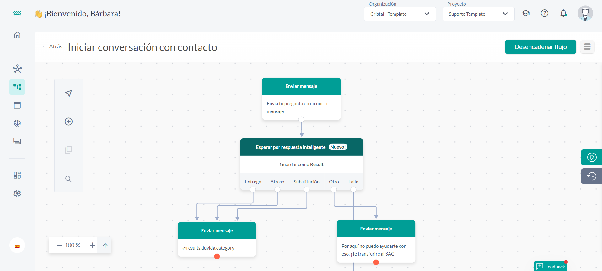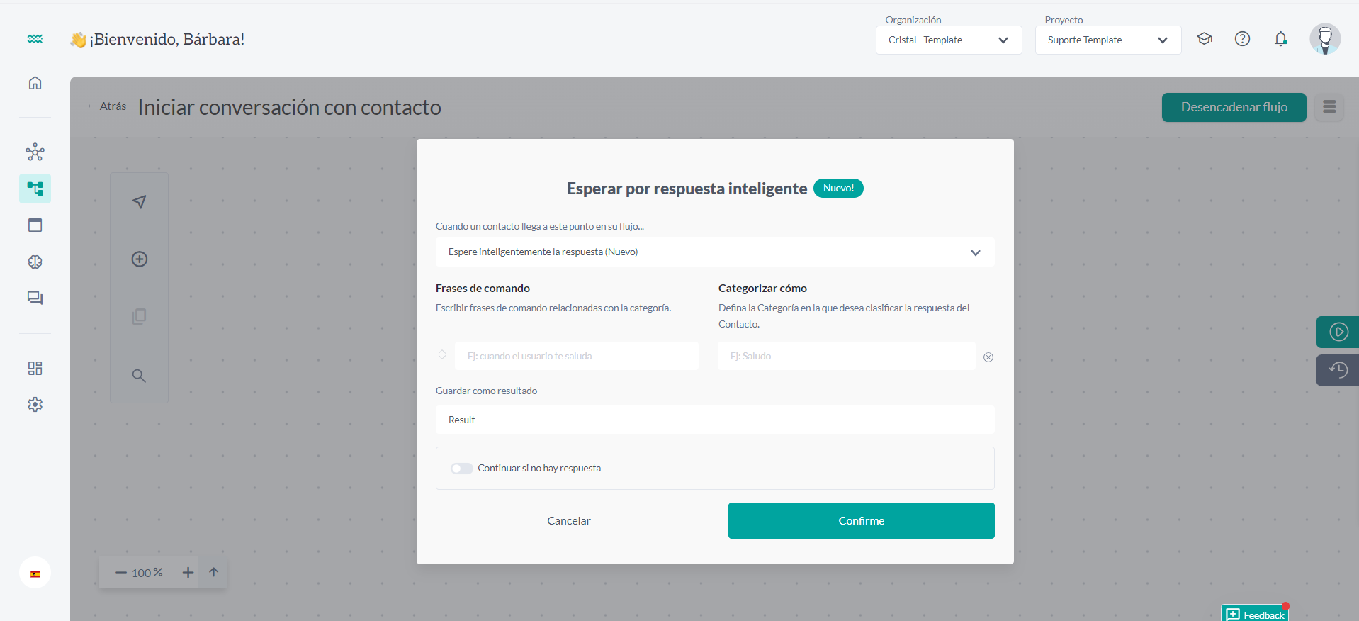 Con la tarjeta "" Esperar por respuesta inteligente"", puede esperar la respuesta del usuario y enviar esa respuesta directamente a su Clasificación de IA, de modo que pueda crear sus categorías y tratar cada intención según desee: