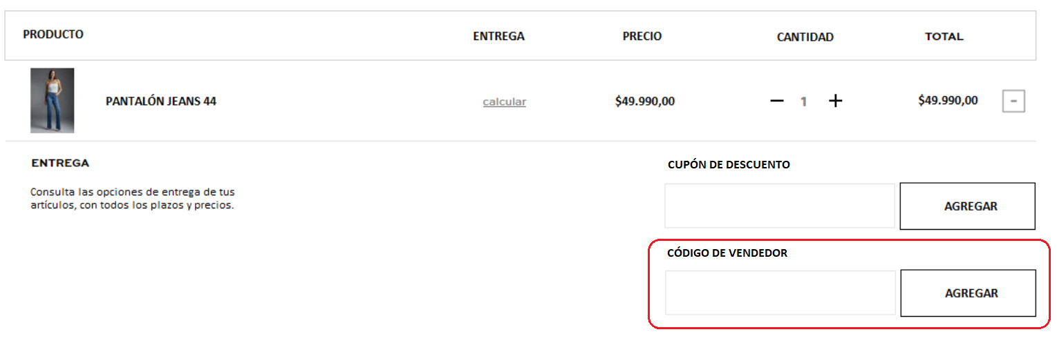 El campo Código de vendedor no sustituye el campo Cupón de descuento (que es nativo en la plataforma VTEX). Al realizar la configuración que se describe en este artículo, puedes utilizar los dos para ofrecer descuentos.
