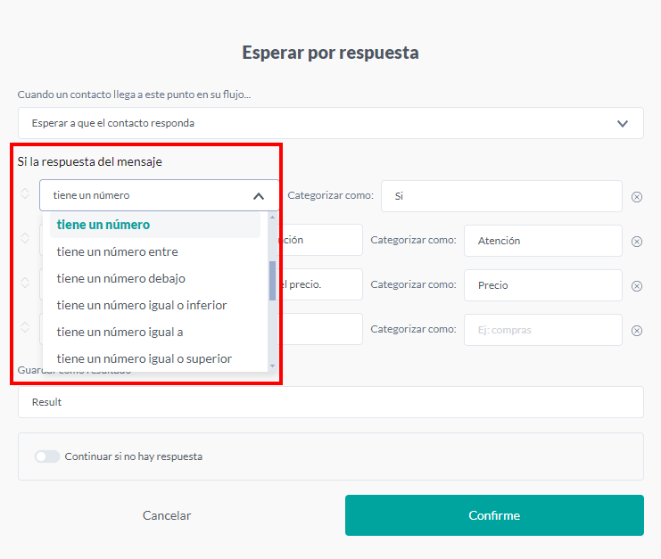 - Tiene un número igual o superior: Si la respuesta/valor es mayor o igual al número seleccionado, seguirá la ruta indicada.