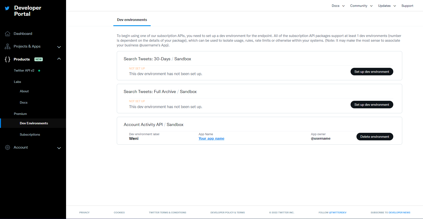 2. Luego, deberás crear un entorno de desarrollo para que tu aplicación se ejecute. Deberás crear un entorno para la Account Activity API / Sandbox. Puedes nombrarlo como desees; recomendamos ""producción."" Asegúrate de seleccionar la aplicación que creaste en esta etapa. Este nombre se usará al conectar la cuenta en la Plataforma Weni.
